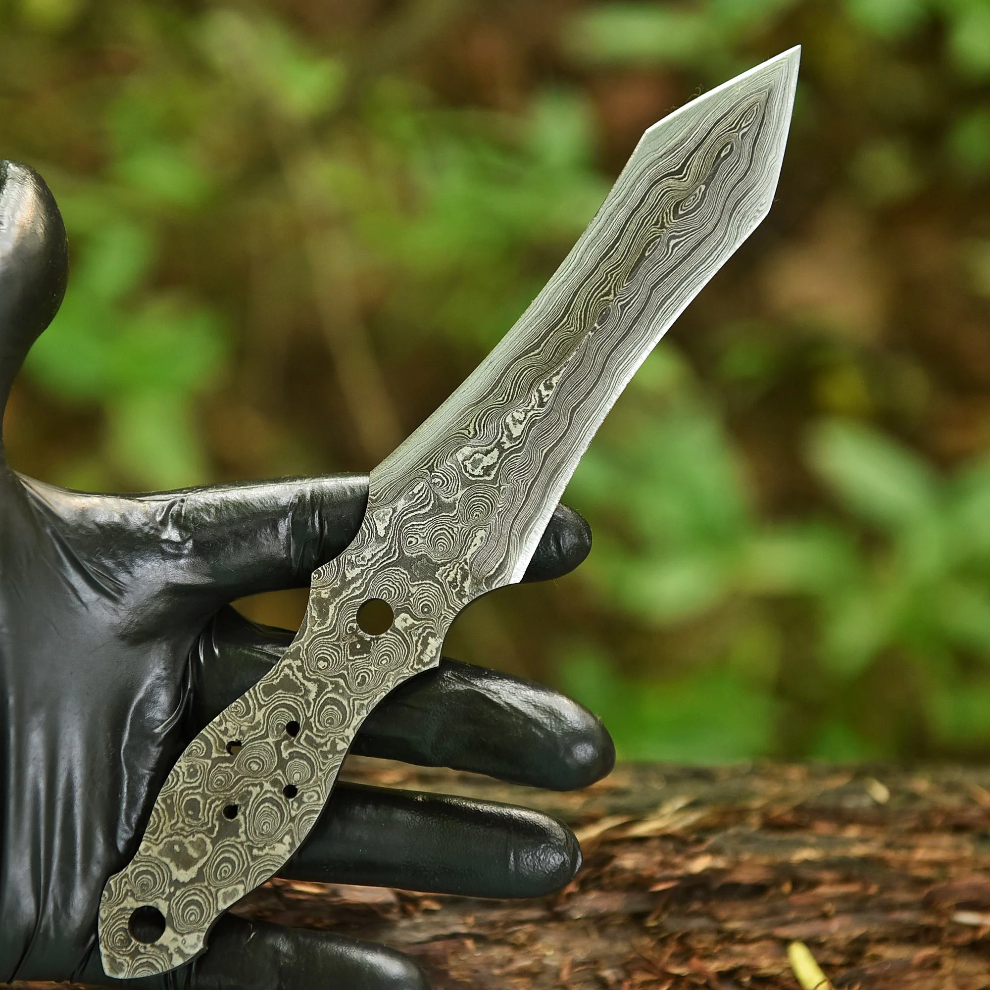 Crafted for precision and balance, this high-carbon Damascus steel dagger blade blank is hand-forged to deliver exceptional strength, symmetry, and visual character. The double-edge design offers excellent piercing performance, while the full-tang profile makes it ideal for custom handle installation and professional knife-making projects.
