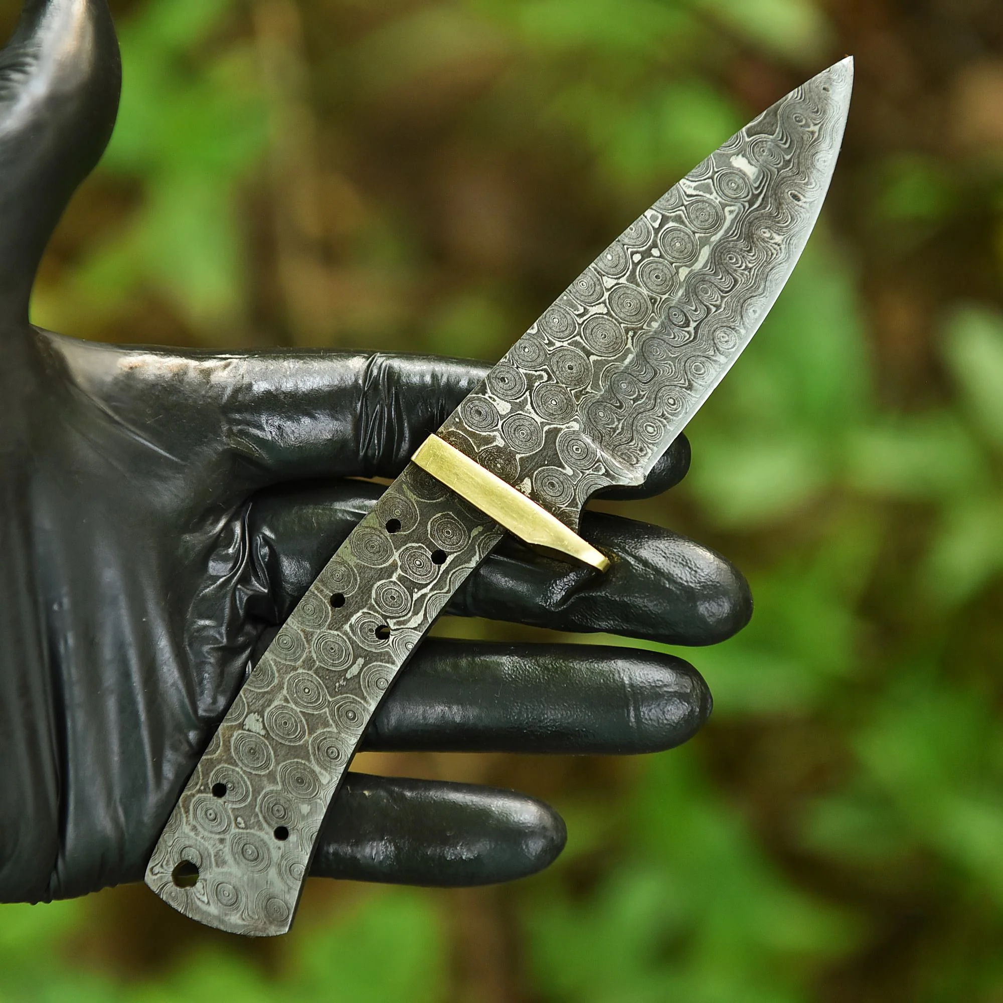 A solid brass guard is fitted at the base of the blade, adding balance, hand protection, and a refined contrast to the patterned steel. The exposed full tang, measuring 3 inches, is pre-drilled and ready for handle scales, allowing for easy customization and secure assembly.