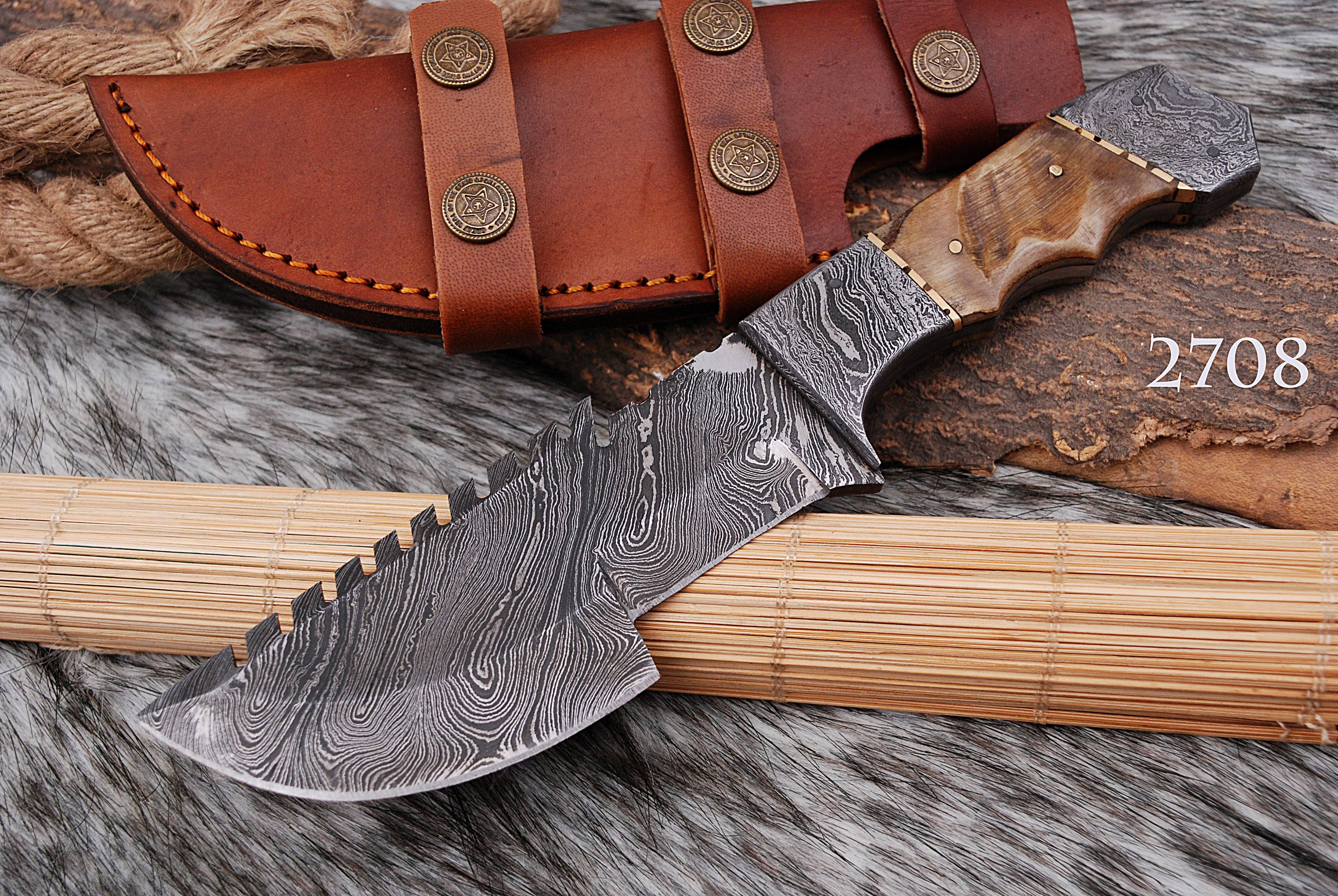 This superb design knife is hand forged. Blade of this knife has a nice file work and is made of 512 layers of stainless steel and high carbon steel with hardness 55-60 HRC. This robust knife is lab tested under intense conditions,; the balance and shape of this knife ensures perfect grip.
