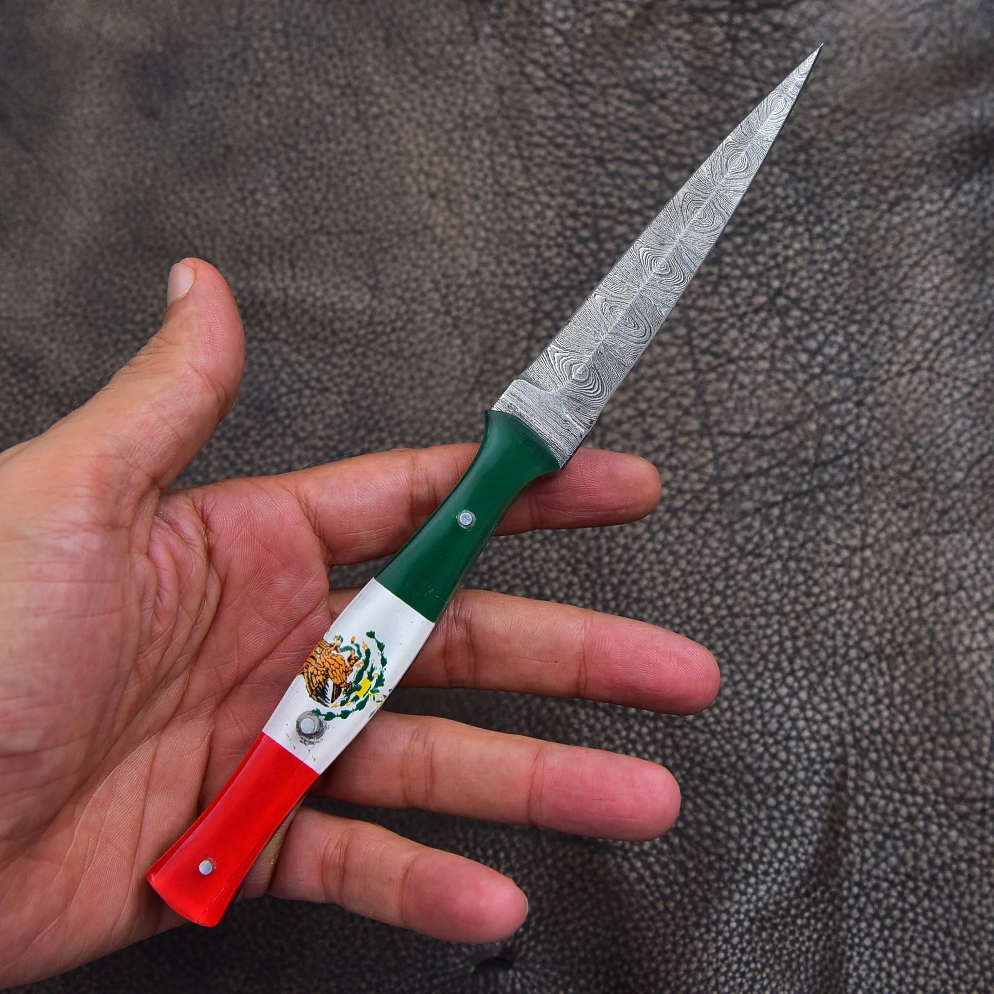 Handmade Damascus Steel Double Edged Blade Knife with Mexican Flag Handle Boot Knives